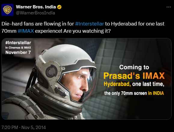 In November 2014, when Christopher Nolan’s Interstellar opened in theatres, Prasads was reportedly the only place in India where the space drama was watched on 70mm film.